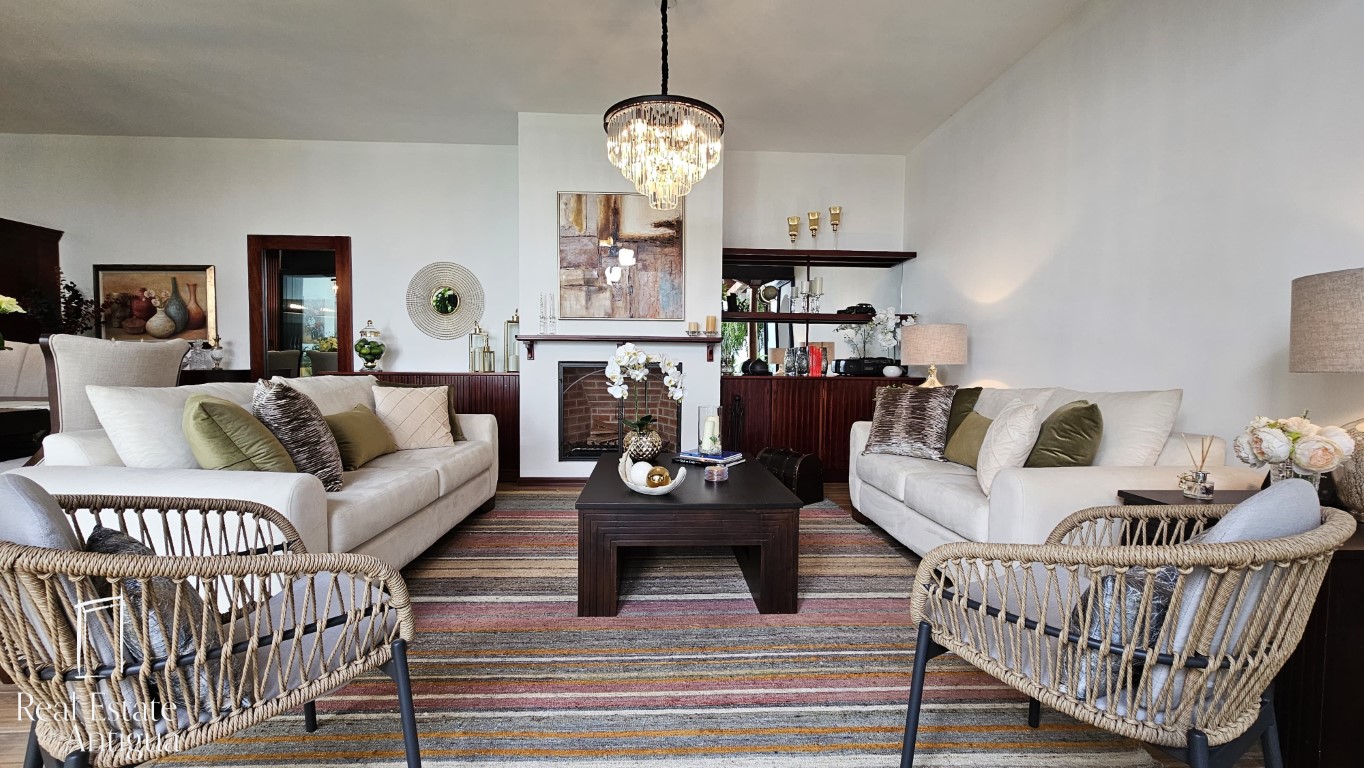El área social está integrado al tradicional corredor de terraza española con vista hacia un bello jardín central con un muro llorón, encontramos una chimenea en la sala, la cual está integrada hacia el comedor y la cocina está separada por medio de una práctica península que nos permite utilizarlo también cómo una bufetera si fuese necesario, la cocina cuenta con techos altos, top de cuarzo y muebles todos sus muebles elegantemente pintados de blanco y con luz indirecta.