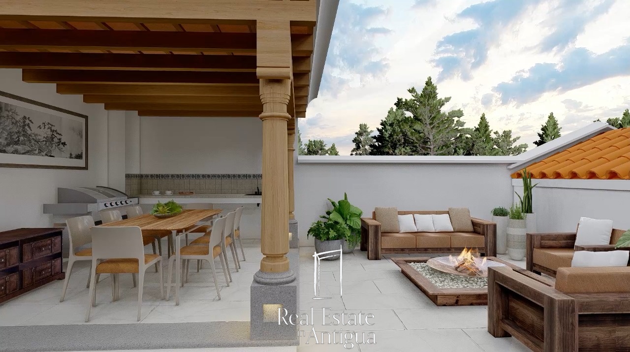 En el segundo nivel contamos con un área social abierta en donde podremos gozar bajo una pérgola de terraza española reuniones al aire libre con espacio para churrasquera y un área que se podría utilizar como un bar u otro uso. Desde este espacio contamos con impresionantes vistas al volcán de fuego y Acatenango.