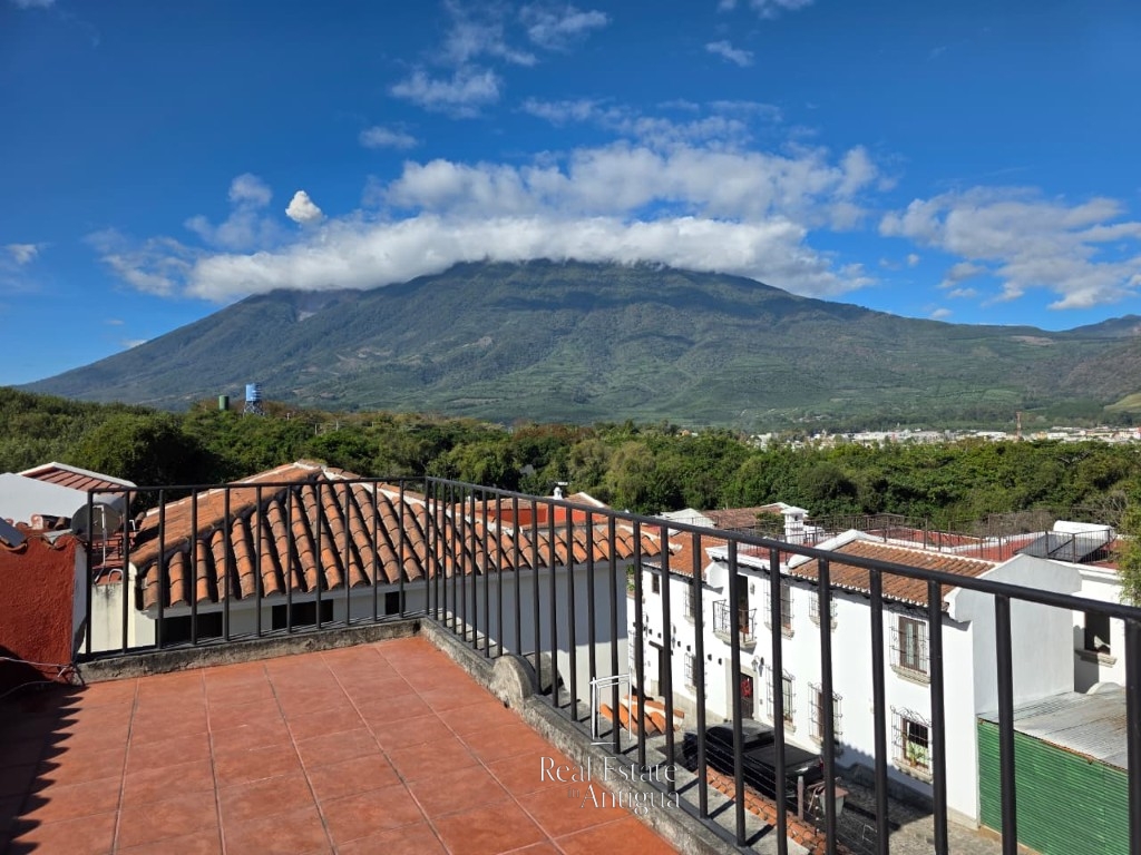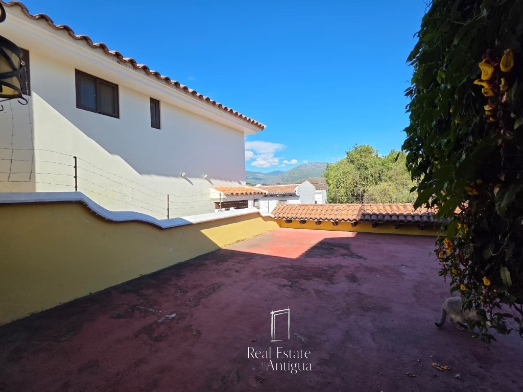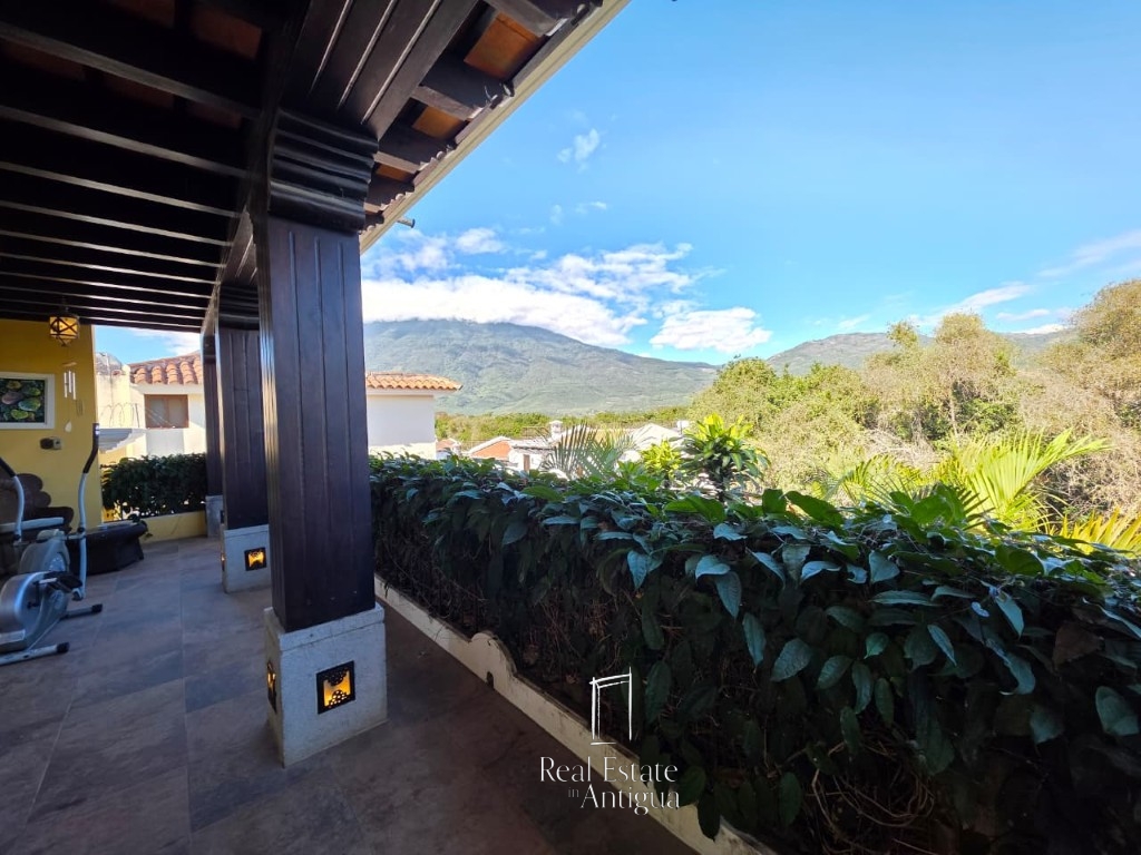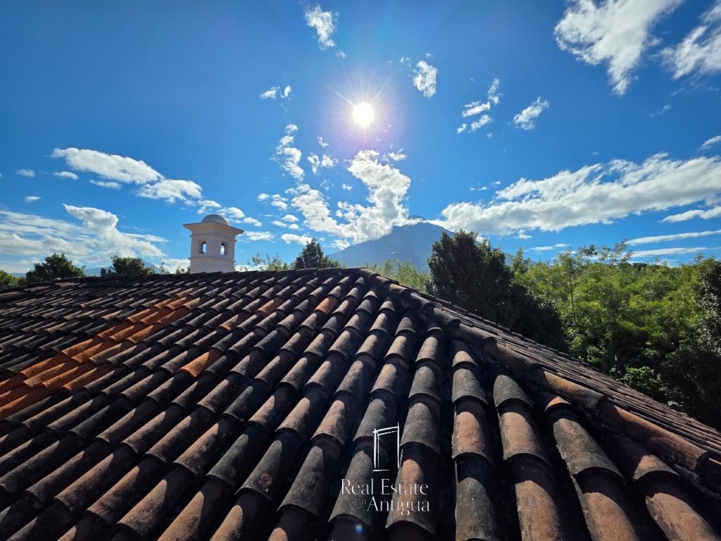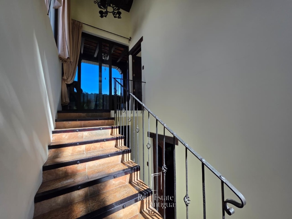 On the third level we find a huge master bedroom with fireplace, private bathroom with walk-in closet, and views of the Agua volcano. Leaving the master bedroom there is a corridor with a Spanish terrace that leads up to a second terrace with excellent views of the three volcanoes and the surrounding area.