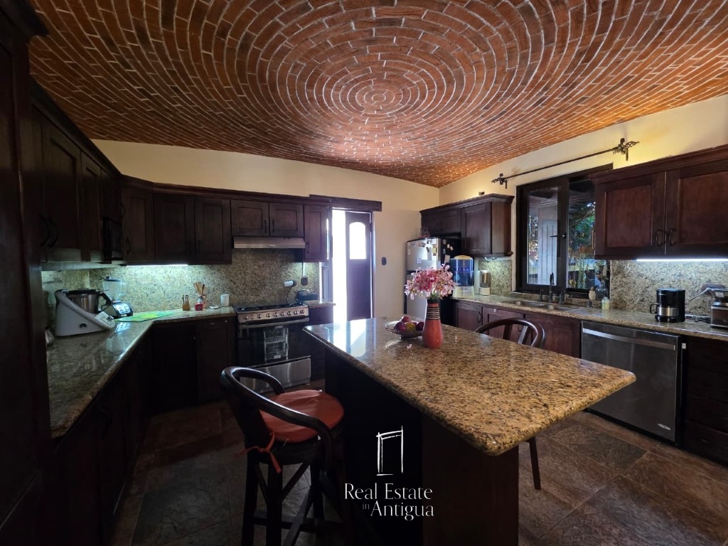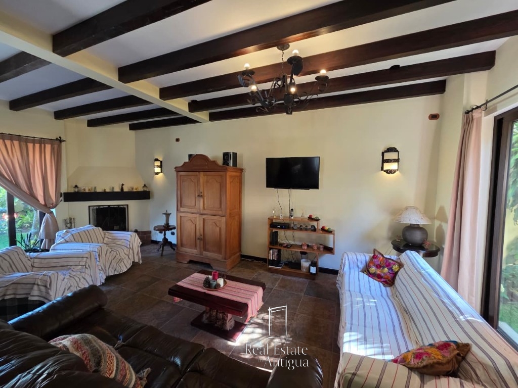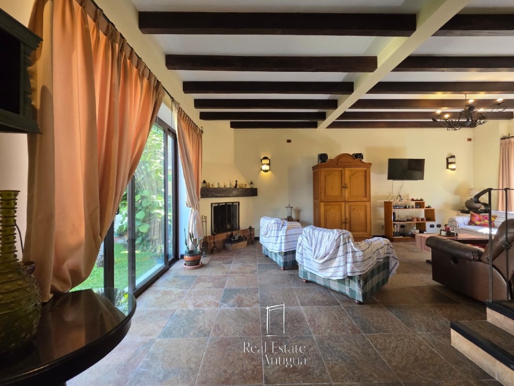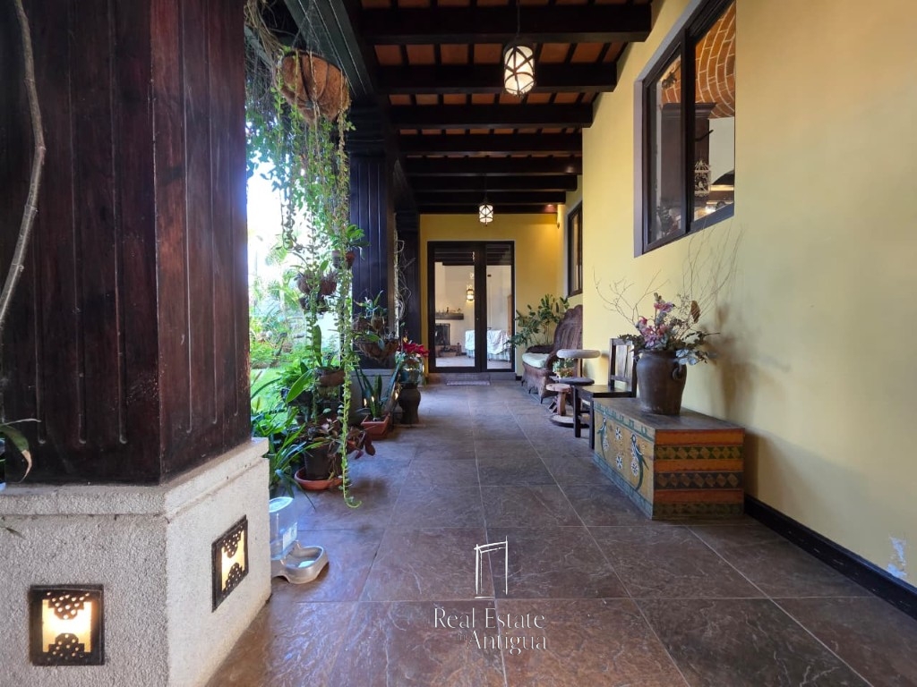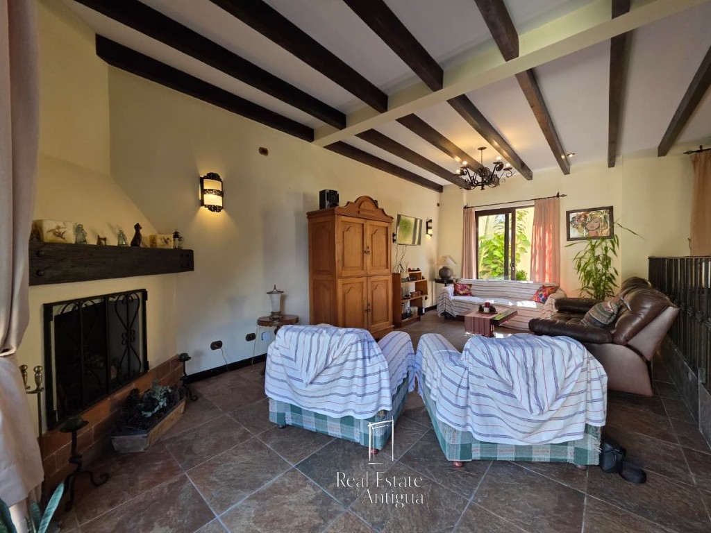 On the third level we find a huge master bedroom with fireplace, private bathroom with walk-in closet, and views of the Agua volcano. Leaving the master bedroom there is a corridor with a Spanish terrace that leads up to a second terrace with excellent views of the three volcanoes and the surrounding area.