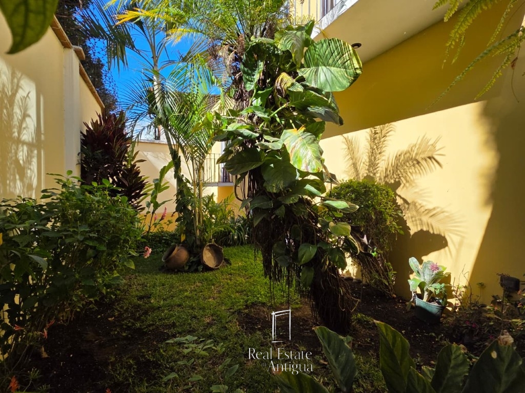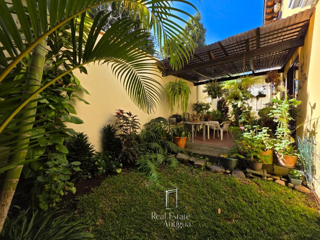 This spacious house located in Hacienda del Comendador has three levels with colonial antique details. Upon entering we find a beautiful garden and path to the entrance of the house. The first level has a social area that integrates living-dining room, large kitchen with wood cabinets and quartz top, all overlooking a second garden behind the house,